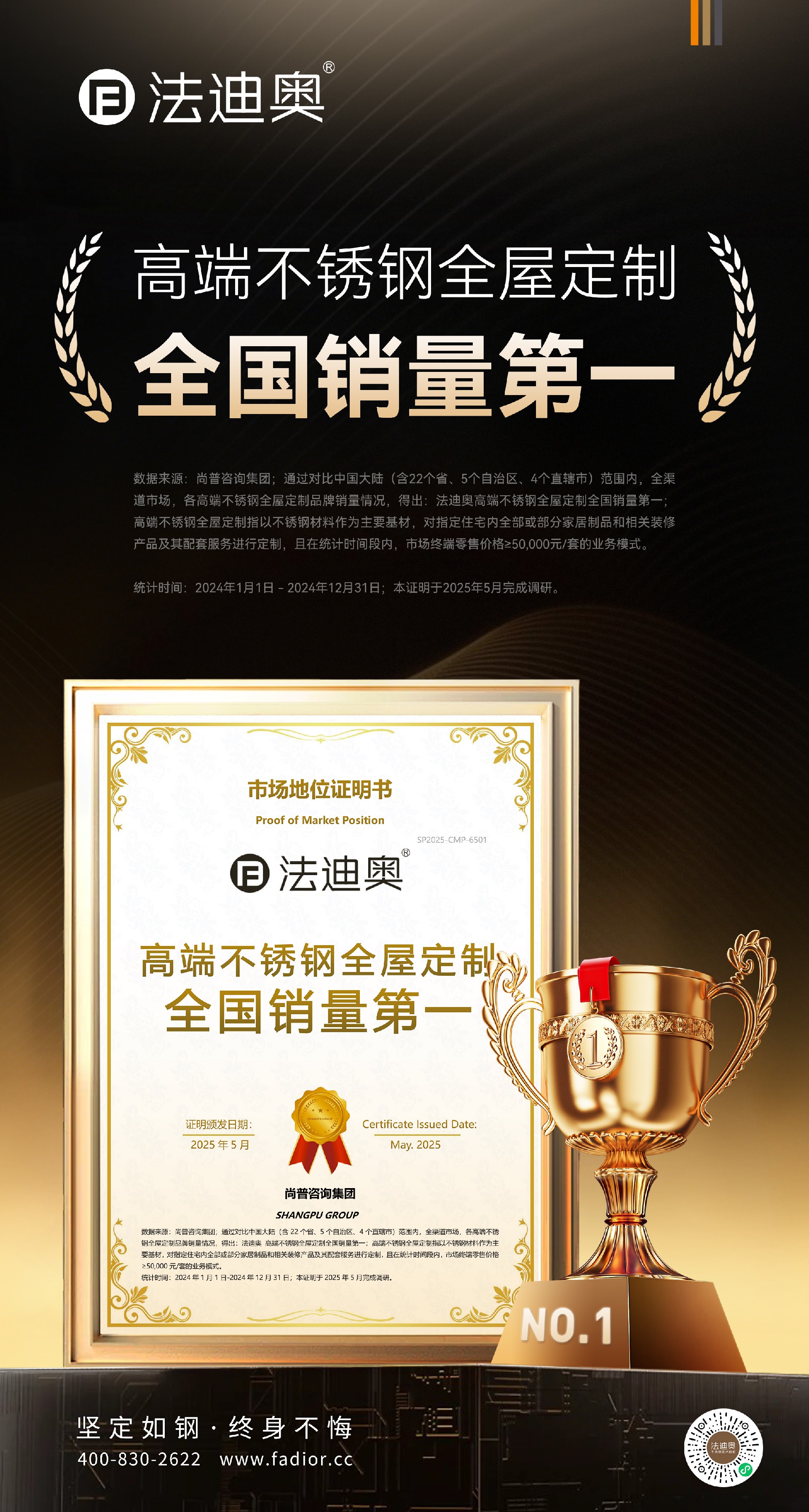 2025年5月18日,尊龙凯时荣获「高端不锈钢全屋定制全国销量第一」「无胶水全屋定制行业首创」权威认证。